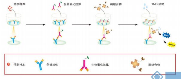 霉亲和素会发生高强度的非共价结合;洗板后加入显色剂底物 TMB,若反应孔中样品存在不同浓度的人IL-21,则 HRP 会使无色 TMB 变成不同深浅(正相关)的蓝色物质,加入终止液后反应孔会变成黄色;最后,在λmax=450 nm(OD=450 nm)处测定反应孔样品吸光度(OD),样本中的人 IL-21 浓度与 OD 成正比,通过绘制标准曲线和四参数拟合软件便可计算出样本中人 IL-21 的浓度。