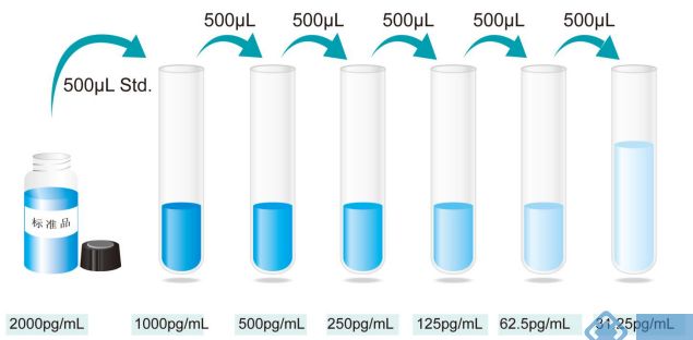 3. 标准品梯度稀释:加入标准品/样本稀释液(SR1)1ml至冻干标准品中,静置15分钟待其完全溶解后轻轻混匀(浓度为2000pg/ml),然后按照以下浓度进行2倍稀释: 2000、1000、500、250、125、62.5、31.25、