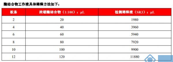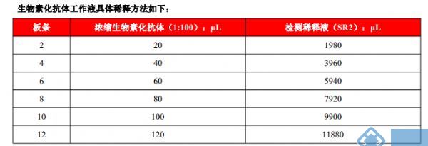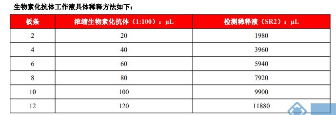 4. 生物素化抗体工作液:预先计算好试验所需用量,用检测稀释液(SR2)将100倍抗体浓缩液稀释成1倍用工作液(稀释前充分混匀),请在30分钟内加入到反应孔中。