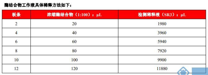 5. 酶结合物工作液:按每次试验所需用量配制,用酶结合物稀释液(SR3)将100倍浓缩酶结合物稀释成1倍应用工作液(稀释前离心),请在30分钟内使用。